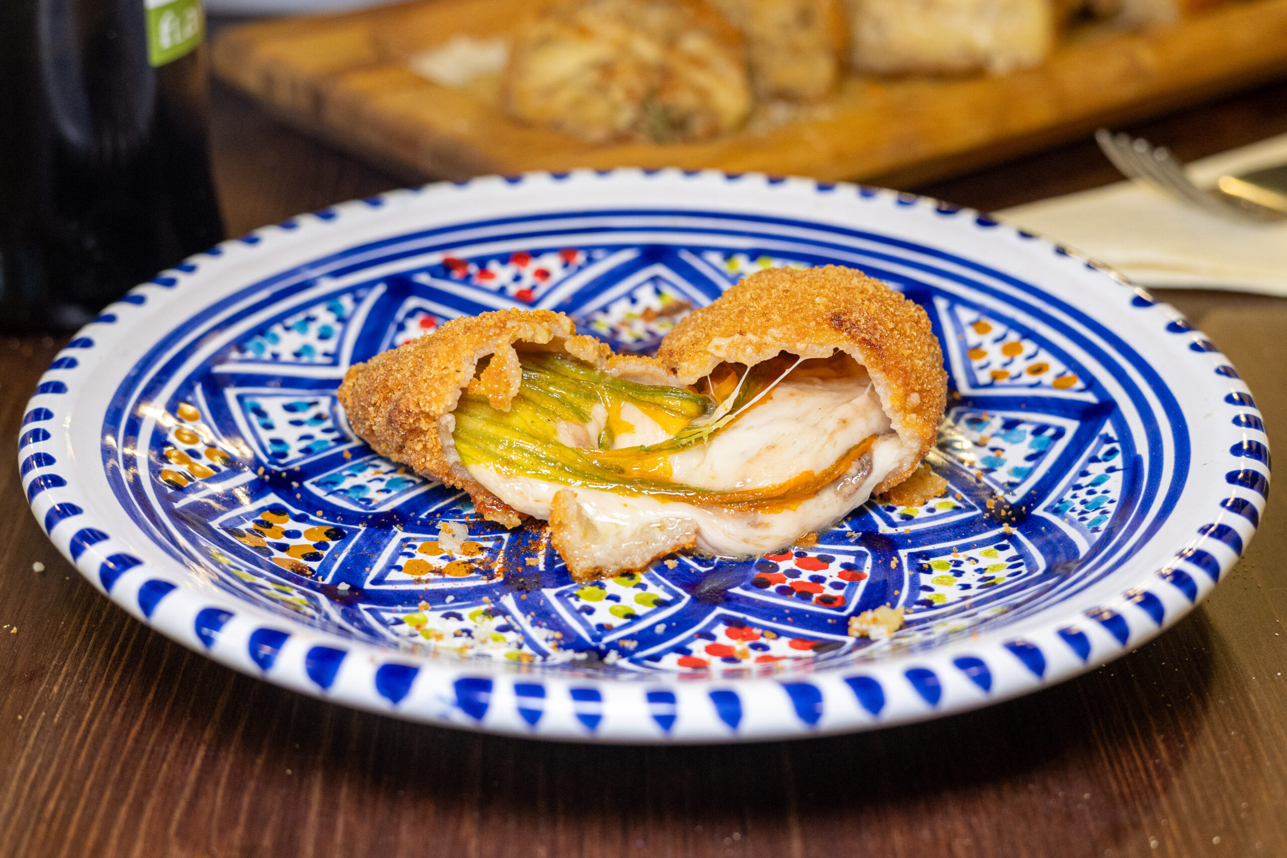 Mozzarella filante racchiusa in un Fiore di zucca, avvolto in una doppia panatura croccante che esalta consistenze e gusto. Un ricordo di famiglia trasformato in un morso deciso e appagante.