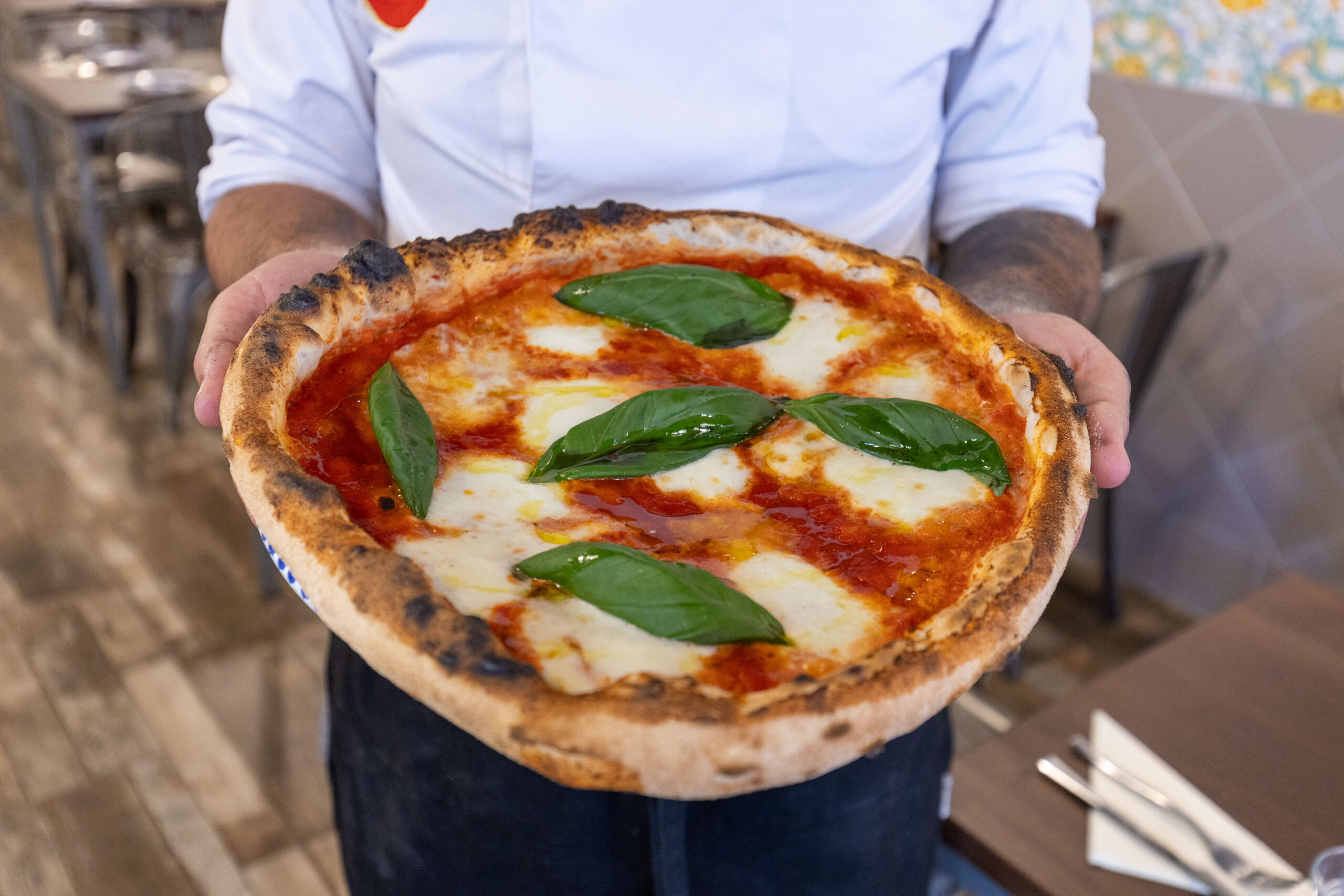 Ci siamo riusciti con l’impasto studiato dal nostro Pizzaiolo Raoul, lavorato 100% a freddo, e con una cottura più lenta su pietra refrattaria a 400 gradi.